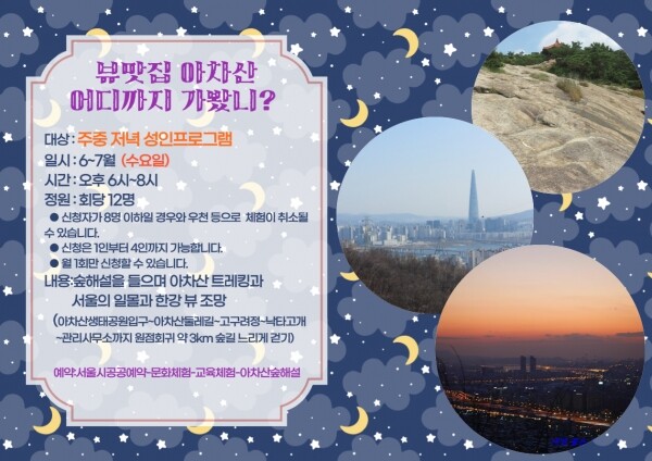 ‘뷰 맛집 아차산 어디까지 가봤니?’는 6월부터 7월까지 매주 수요일 오후 6시~8시까지 총 9회 진행되며 매회 성인 12명을 대상으로 선착순 마감한다.