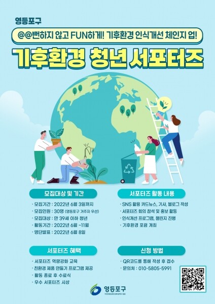 서포터즈로 활동하기 원하는 청년은 포스터에 있는 QR코드를 스캔하거나 영등포구 홈페이지 게시글의 링크로 접속해 신청서를 제출하면 된다.