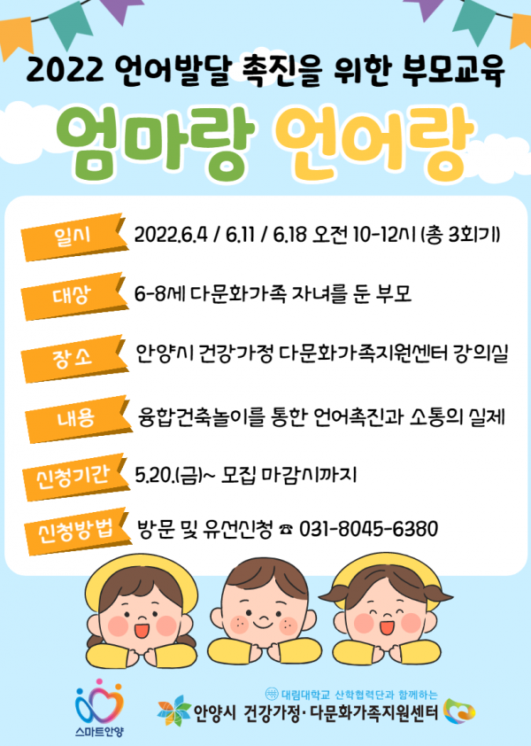 6~8세 유아기의 자녀를 둔 다문화가족의 부모와 자녀를 대상으로 6월 4일부터 18일까지 매주 토요일 오전 10시~12시 센터 내 강의실에서 대면으로 실시한다.