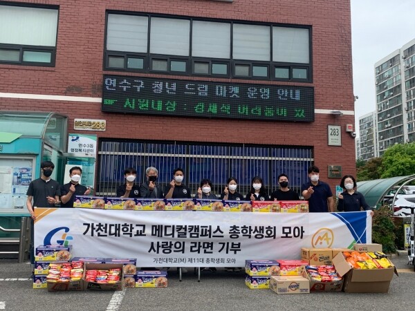 가천대학교 메디컬 캠퍼스 총학생회는 지난 26일 가천대 메디컬캠퍼스에서 열린 2022년 가천대 축제에서 가천대 통합10주년을 기념해 취약계층을 위한 라면 기증 행사를 개최했고 교직원 및 학생들이 기부한 라면을 이날 전달했다.