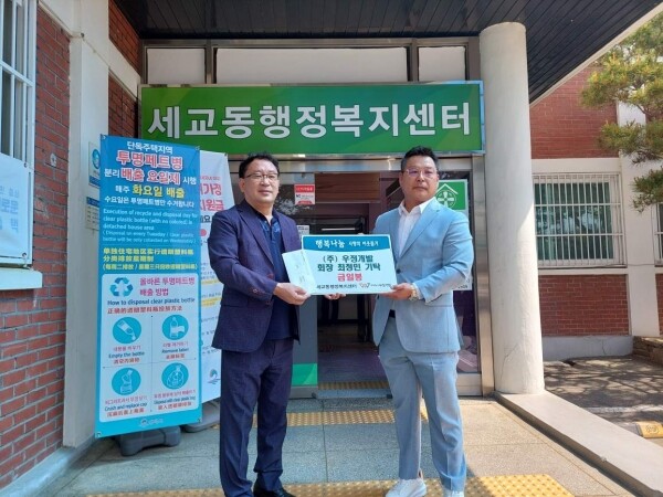 차정우 세교동장은 “어려운 이웃을 위해 정성을 보내준 ㈜우정개발 최정민 회장님께 감사드리며 기탁해주신 물품은 도움이 필요한 세교동 어려운 이웃들에게 소중히 전달하겠다”고 했다.