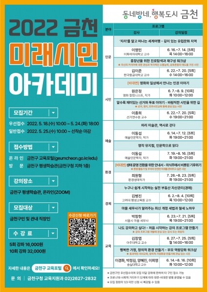‘2022 금천미래시민아카데미’는 인문, 시민, 예술, 환경, 경제, 교육 총 6개 분야에서 전문 강사진을 초청해 수준 높은 교육과정을 운영한다.