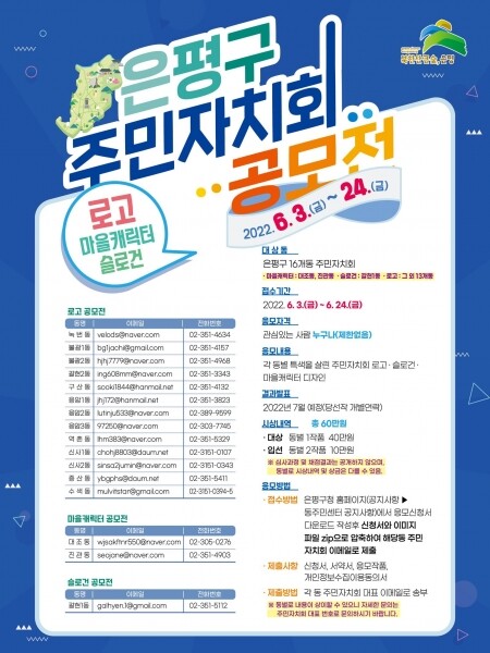 ‘로고 공모전’은 녹번동 등 13개 동에서 열리며 그 외 이미 로고가 있는 대조동과 진관동은 ‘마을캐릭터 공모전’, 갈현1동은 ‘슬로건 공모전’이 열린다.