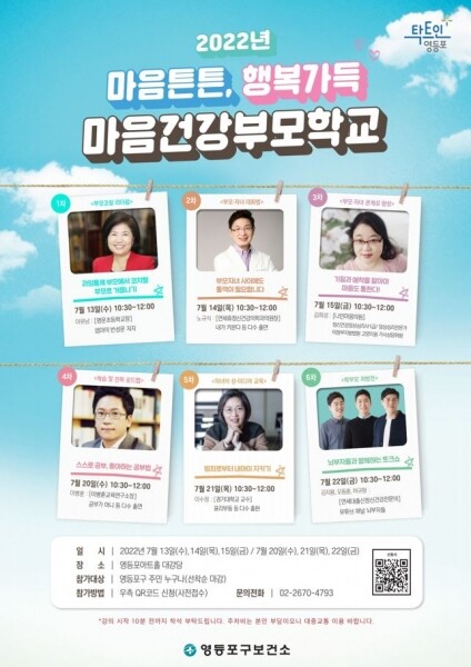 이번 마음건강부모학교는 오는 7월 13일부터 15일 7월 20일부터 22일까지 총 6회에 걸쳐 진행되며 아동·청소년 정신건강 분야에서 손꼽히는 명강사들의 특강과 토크쇼가 열린다.