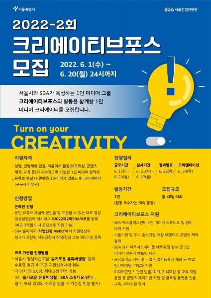 신청을 희망하는 크리에이터는 오는 6월 20일 24시까지 SBA 홈페이지 ‘사업신청 Mybiz’ 페이지에서 ‘지원 신청서’ 작성 후 제출하면 된다.
