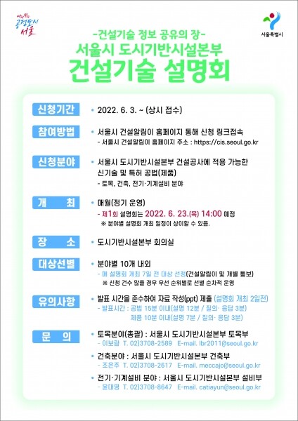 설명회는 서울시 도시기반시설본부 건설공사에 적용 가능한 건설기술을 대상으로 토목, 건축, 전기·기계설비 등 3개 분야로 구분해 운영된다.
