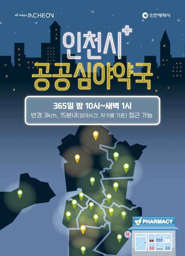 시는 현재 공공심야약국이 운영되지 않거나 멀어서 이용에 불편이 있는 검단·청라·연수 3개 지역에 공공심야약국을 추가로 지정해 이용객의 불편을 해소하고 인천시민 누구나 반경 3km 안의 공공심야약국을 15분 내에 이용할 수 있게 한다는 방침이다.