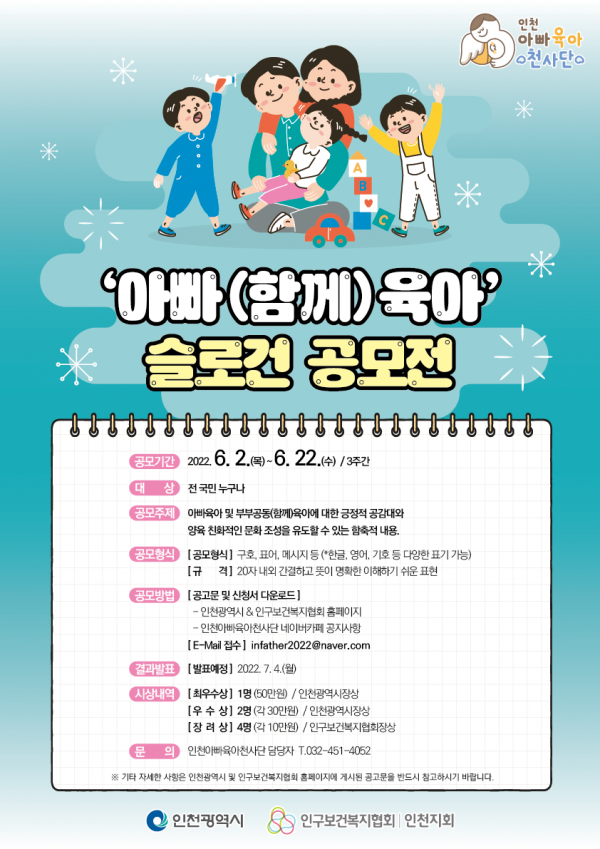 접수기간은 오는 6월 2일부터 6월 22일까지 3주간이며 인천광역시 및 인구보건복지협회 홈페이지와 인천아빠육아천사단 커뮤니티 공지사항을 통해 제출서류를 내려 받아 e-메일 접수하면 된다.