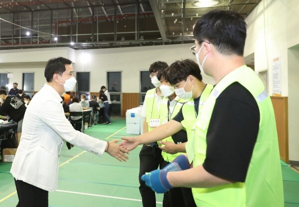 서 시장은 1일 오후 10시 화성종합경기타운 실내체육관에 설치된 개표소를 방문해 직원들을 격려하고 현장 상황을 점검했다.