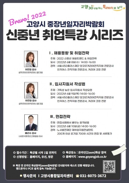 사전 신청은 고양시 중장년일자리박람회 홈페이지에서 가능하며 신청자에 한해 화상회의솔루션 참여 안내문자를 발송할 예정이다.