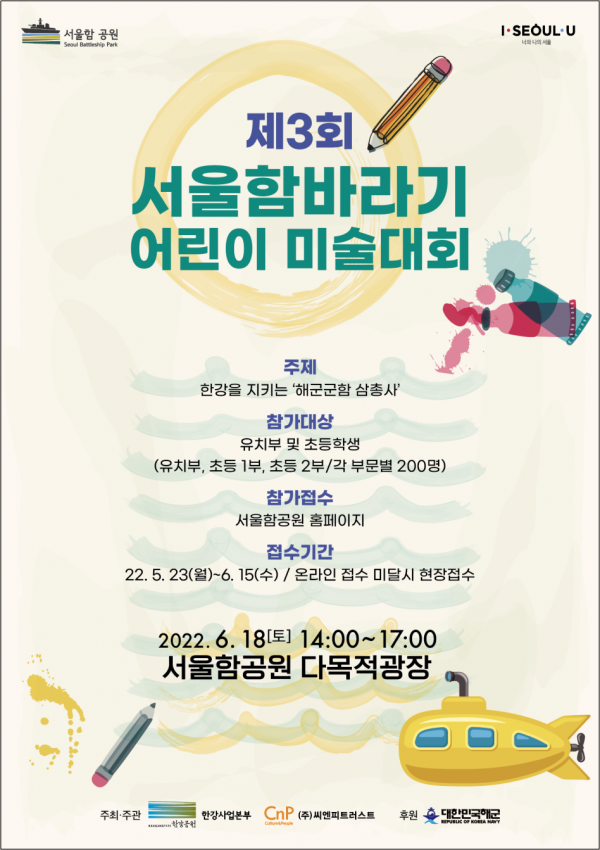 서울시 한강사업본부는 오는 6월 18일 가족 나들이 명소인 망원한강공원 서울함공원에서 ‘제3회 서울함바라기 어린이 미술대회’를 개최한다고 밝혔다.