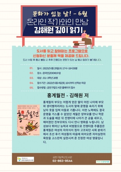 참여 대상은 초등학교 1~3학년 20명이며 6월 4일 오전 10시부터 금천구립도서관 홈페이지 ‘참여공간-문화프로그램 신청’에서 접수할 수 있다.