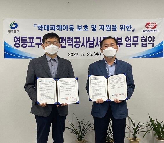 협약식은 지난 5월 25일 영등포구청 복지국장실에서 한전남서울본부의 황익구 전력사업처장과 임직원, 구청 관계부서 직원이 자리한 가운데 ‘학대 피해아동 보호 및 지원을 위한 민·관 협력체계 구축’ 협약서를 교환하며 피해의 예방과 관리에 적극 협조해나가기로 했다.