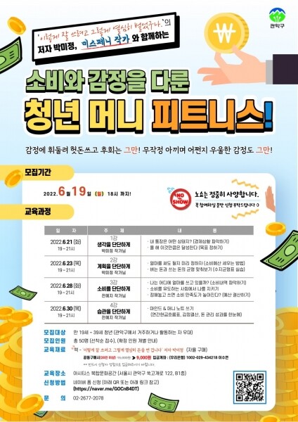 ‘이렇게 잘 쓰려고 그렇게 열심히 돈을 번겁니다’의 저자 박미정, 미스패니 작가를 강사로 초청해 청년의 적정 소비생활과 경제활동으로 인한 스트레스 극복을 돕고 소통을 통한 피드백도 제공한다.