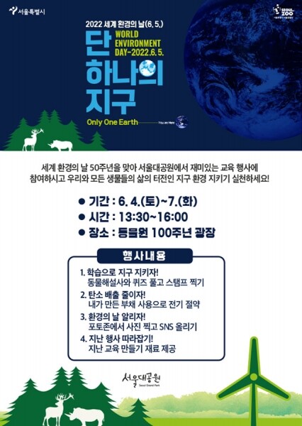 이번 행사는 올해로 50주년을 맞은 ‘세계 환경의 날’을 기념해 우리와 동식물의 삶의 터전인 하나뿐인 지구의 소중함을 알리고 보전의 중요성과 실천에 대한 교육을 실시할 예정이다.
