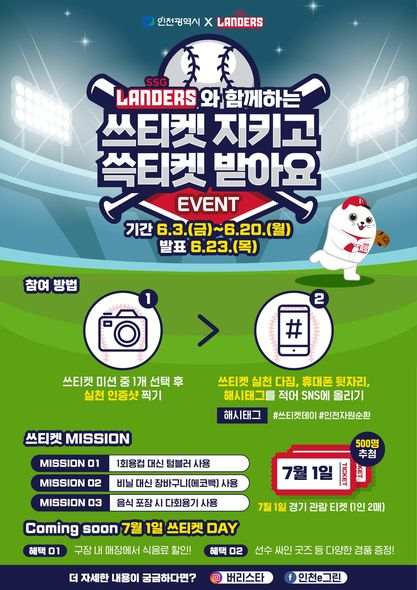 시와 SSG랜더스는 야구장 내 소모되는 1회용품의 사용을 줄이고 다회용기 사용을 유도하고자, 7월 1일을 다회용기 사용 실천의 날인 ‘쓰티켓데이’로 정하고 캠페인을 운영하기로 했다.