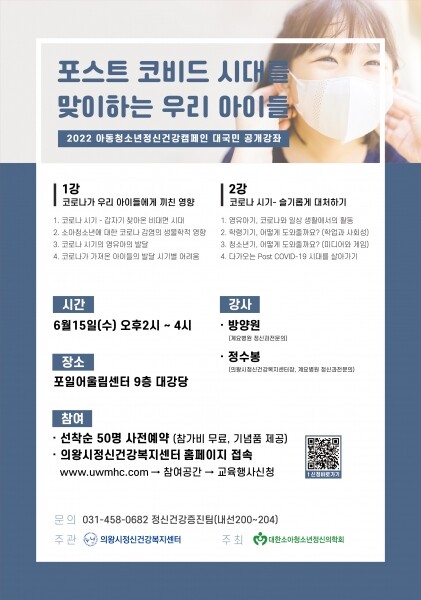 의왕시정신건강복지센터 홈페이지에서 사전신청 접수 중이며 강좌에 참여하면 소정의 기념품과 간식도 제공된다.
