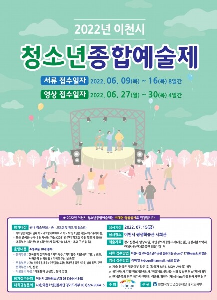 금년 이천시 종합예술제 예선은 작년과 동일하게 대면 경연대신 온라인 영상 접수를 통해 이루어지며 심사 역시 심사위원들만 모여 진행한다.