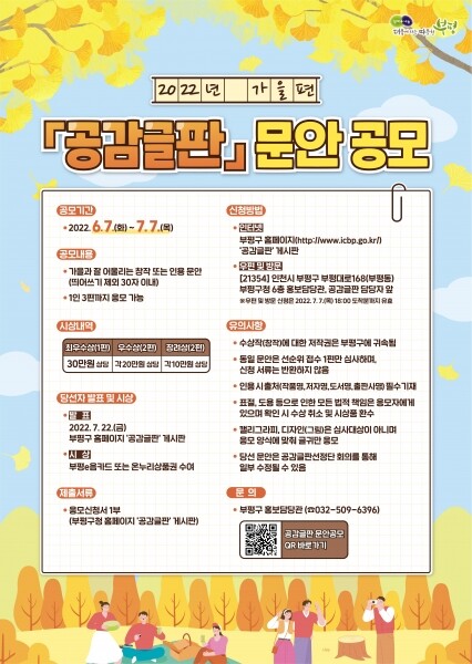 공감글판 문안을 제출하려는 주민은 부평구 홈페이지 ‘공감글판’ 게시판에서 응모하거나 구청 홍보담당관으로 우편 발송, 또는 방문 제출하면 된다.