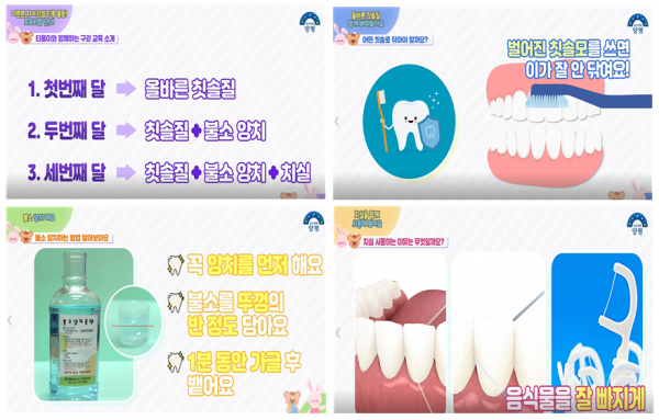 구강보건교육 영상에는 아이들이 친근하게 느낄 수 있는 치과위생사협회 캐릭터 티롱을 이용해 칫솔질과 불소, 치실 사용 방법을 재미있게 설명해 유아들이 집중해서 영상을 볼 수 있도록 제작했으며 영상과 함께 실습을 위한 치아지킴 꾸러미 세트가 제공된다.