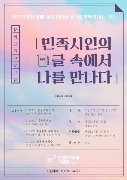 이번 프로그램은 문학작품을 통해 독립운동과 애국심을 어렵지 않게 이해하고 현직 작가 강사와 함께 회차별로 나만의 서시 쓰기 나를 대표하는 숫자 찾기 위로카드 건네주기 내 맘대로 마인드맵 완성 등의 체험활동 시간을 제공한다.