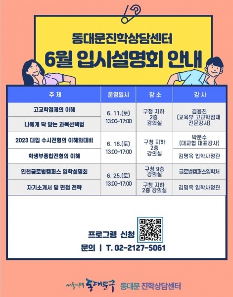 구 관계자는 “이번 ‘동대문진학상담센터 6월 설명회’는 대입을 준비하는 학생과 학부모에게 고교학점제, 대입전형 등 복잡한 진학 정보를 알기 쉽게 전달하기 위해 마련됐다”며 “지역의 미래인 학생들의 풍요로운 삶과 올바른 성장을 위해 앞으로도 주민들의 요구에 맞춰 다양한 진학프로그램을 제공할 수 있도록 최선을 다하겠다”고 밝혔다.