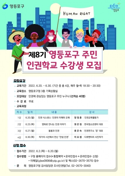 채현일 영등포구청장은 “이번 교육을 통해 구민의 인권감수성 향상은 물론 인권적 소양을 갖춘 활동가들이 다수 양성되길 바란다”며 “앞으로도 혐오와 차별 없이 모두의 인권이 존중받는 사회를 만들기 위해 최선을 다하겠다”고 전했다.