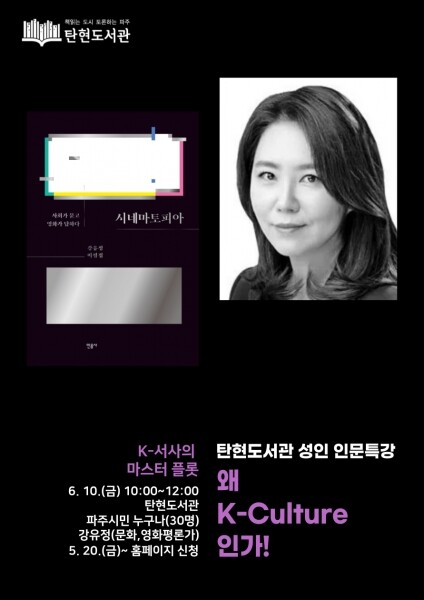 [뉴스써치] 파주시 탄현도서관이 오는 10일 성인 인문특강 프로그램 ‘왜 K-Culture인가’를 운영한다고 밝혔다.