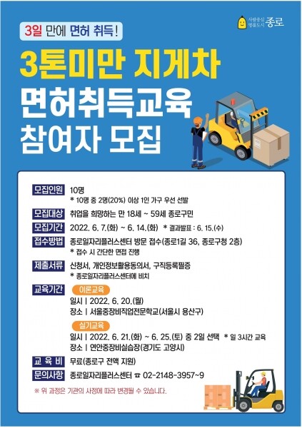 교육 종료 후 이수자에 한해 면허증 발급은 물론 일자리플러스센터와 연계한 취업 알선 등 각종 취업지원 서비스도 제공할 예정이다.