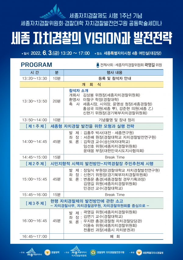 이번 학술세미나는‘세종자치경찰의 비전과 발전전략’이라는 주제에 맞춰, 자치경찰제도가 본격적으로 시행된 지 1주년이 다가오는 시점에서 ‘세종자치의 1년 성과와 소고’, ‘세종형 자치경찰 발전 모형과 실행전략’ 등 뜻깊은 토론의 장을 마련했다.