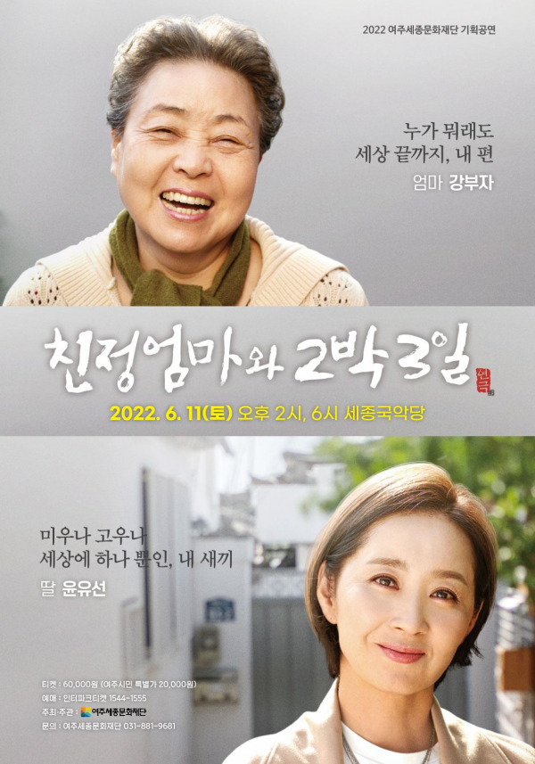 2009년 초연 이래, 누적 관객 80만명을 넘기며 꾸준히 전국에서 관객을 만나온 스테디셀러 연극인 ‘친정엄마와 2박 3일’은 여주에서도 티켓 오픈과 동시에 매진을 기록하며 여주시민들의 큰 기대를 받고 있다.