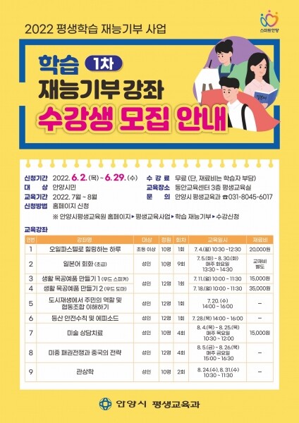 안양시는 금년도 1차 재능기부강좌를 7·8월 개설, 이달 29일까지 선착순 수강생을 모집한다고 7일 밝혔다.