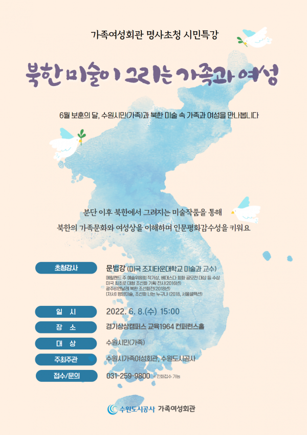 수원에서는 처음으로 열리는 이번 강연회는 평화와 보훈의 달 6월을 맞아 분단 이후 북한에서 그려진 미술작품을 통해 북한의 가족문화와 여성상을 이해할 수 있는 계기를 마련하고자 기획됐다.