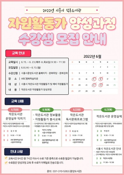 이번 과정은 작은도서관 자원봉사활동에 참여를 원하는 시민은 누구나 수강할 수 있다.
