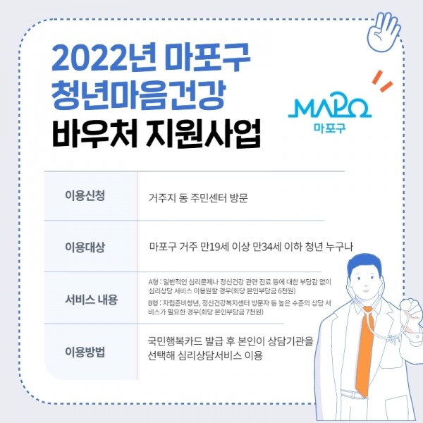 구 관계자는 “심리적으로 어려움을 겪고 있는 청년들이 이번 사업을 적극적으로 이용해 보다 건강하고 행복한 삶을 사는데 도움이 되길 바란다”고 말했다.