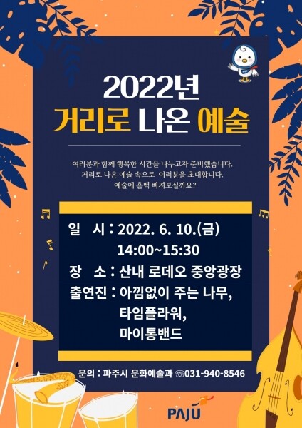 이번 공연은 오는 10일 산내 중앙광장을 시작으로 파주 대표 관광지인 마장호수, 임진각 및 광장, 공원 등에서 매월 마지막 주 경기문화의 날 주간을 포함해 총 12회를 진행할 예정이다.