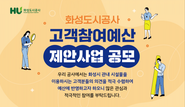 제안서 서식은 ‘화성도시공사 홈페이지-참여·소통-고객참여예산 페이지’에서 내려받을 수 있으며 작성한 제안서는 이메일 팩스 우편 방문을 통해 제출 가능하다.