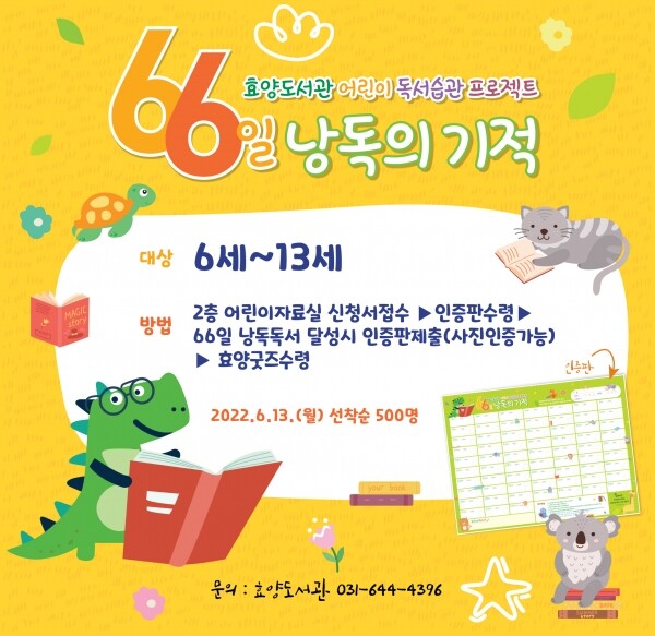 [뉴스써치] 효양도서관은 오는 13일부터 어린이들의 실천적 독서습관 장려 이벤트 “66일 낭독의 기적”을 운영한다.