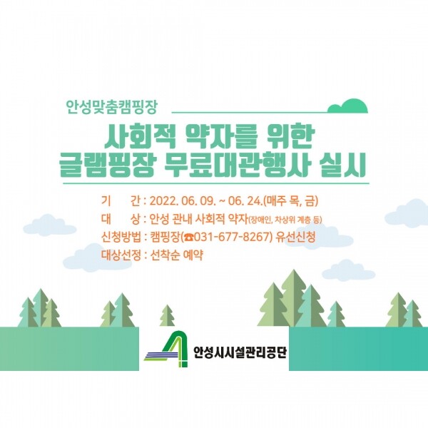 무료대관행사는 6월 9일부터 6월 24일 기간 중 매주 목, 금요일에 진행되며 신청방법은 6월 2일부터 안성맞춤캠핑장으로 유선신청하면 된다.
