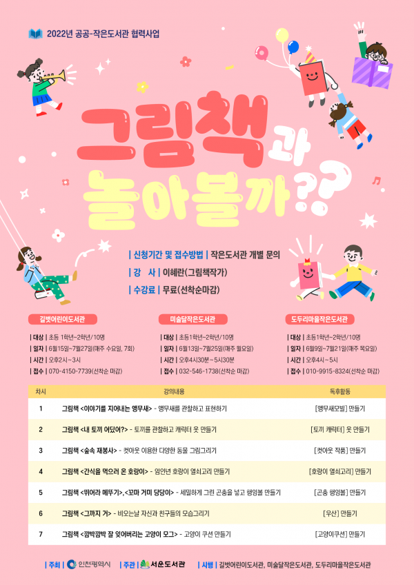 길벗어린이도서관, 미술달작은도서관, 도두리마을작은도서관 총 3개의 작은도서관이 사업에 참여하며 ‘그림책과 놀아 볼까?’라는 주제로 이혜란 작가와 함께 그림책을 읽고 다양한 활동을 체험할 예정이다.