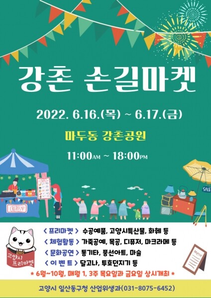 작년에 이어 두 번째로 개최되는 강촌 손길마켓은 고양시 수제품 사업육성, 판로 확보 및 코로나19 장기화로 침체된 일상에 활기를 불어넣을 것으로 기대된다.
