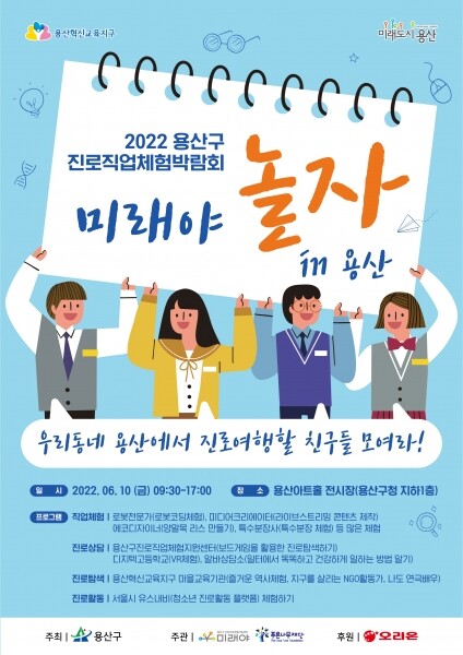 용산구가 주최하는 ‘2022 용산구진로직업체험박람회’는 용산구진로직업체험지원센터 미래야가 주관하고 ㈜오리온에서 후원한다.