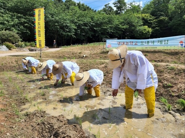 이번 모내기 체험은 1년 간 논을 통한 벼의 생육과정을 공부하며 도심생태계에 대해 배우는 생태논학교의 일부로 관내 초등학생들이 참여하는 프로그램이다.