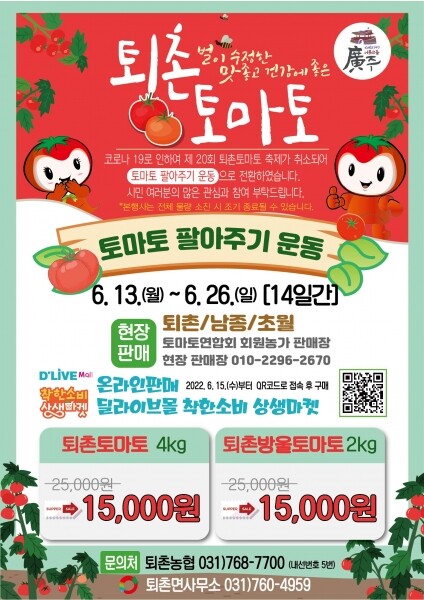 ‘토마토 팔아주기 운동’은 오는 13일부터 26일까지 14일간 진행되며 행사기간 동안 퇴촌토마토 4㎏ 1만5천원, 퇴촌방울토마토 2㎏을 1만5천원에 판매한다.