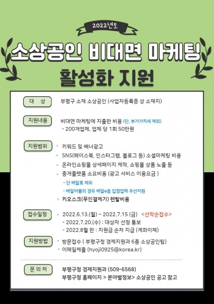 신청자격은 2021년 9월 1일부터 2022년 7월 10일까지 비대면 마케팅에 50만원 이상의 비용을 지출한 2021년 연매출 4억원 미만의 부평구 소상공인이다.
