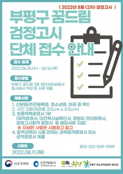 검정고시 원서 단체접수와 관련한 자세한 사항은 부평구 청소년지원센터 꿈드림으로 문의하면 된다.