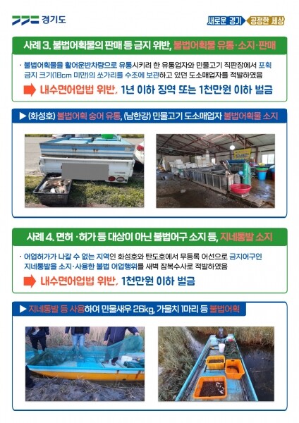 경기도 특사경은 도 해양수산과, 한국농어촌공사와 합동으로 지난 4월 25일부터 5월 27일까지 5주간 남·북한강, 화성호, 탄도호, 임진강, 한탄강 등 비교적 규모가 큰 내수면을 대상으로 어류 산란기에 주로 발생하는 불법 어업행위를 단속해 12건을 적발했다.