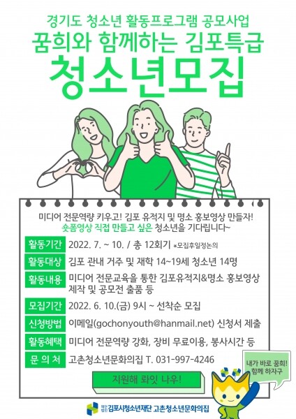 김포 관내 14 ~ 19세 청소년 14명을 대상으로 운영되며 6월 10일 9시부터 선착순으로 모집한다.