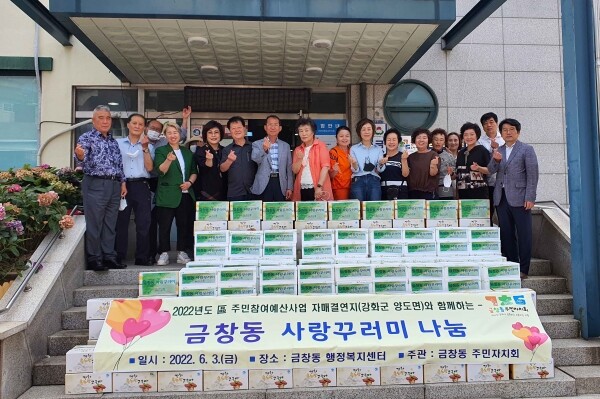 이날 행사에서 전달한 사랑꾸러미에는 금창동의 자매 결연지 강화군 양도면의 특산물인 고구마와 사자발약쑥으로 만든 떡을 담았다.