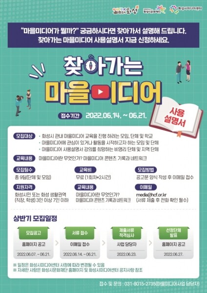 이번 사업은 마을미디어에 관심이 있거나 활동을 시작하고자 하는 모임 및 단체, 마을미디어 사용설명서 강의를 희망하는 비영리 단체 및 지역 단체, 화성시 관내 마을미디어 교육을 진행하고자 하는 학교를 대상으로 한다.